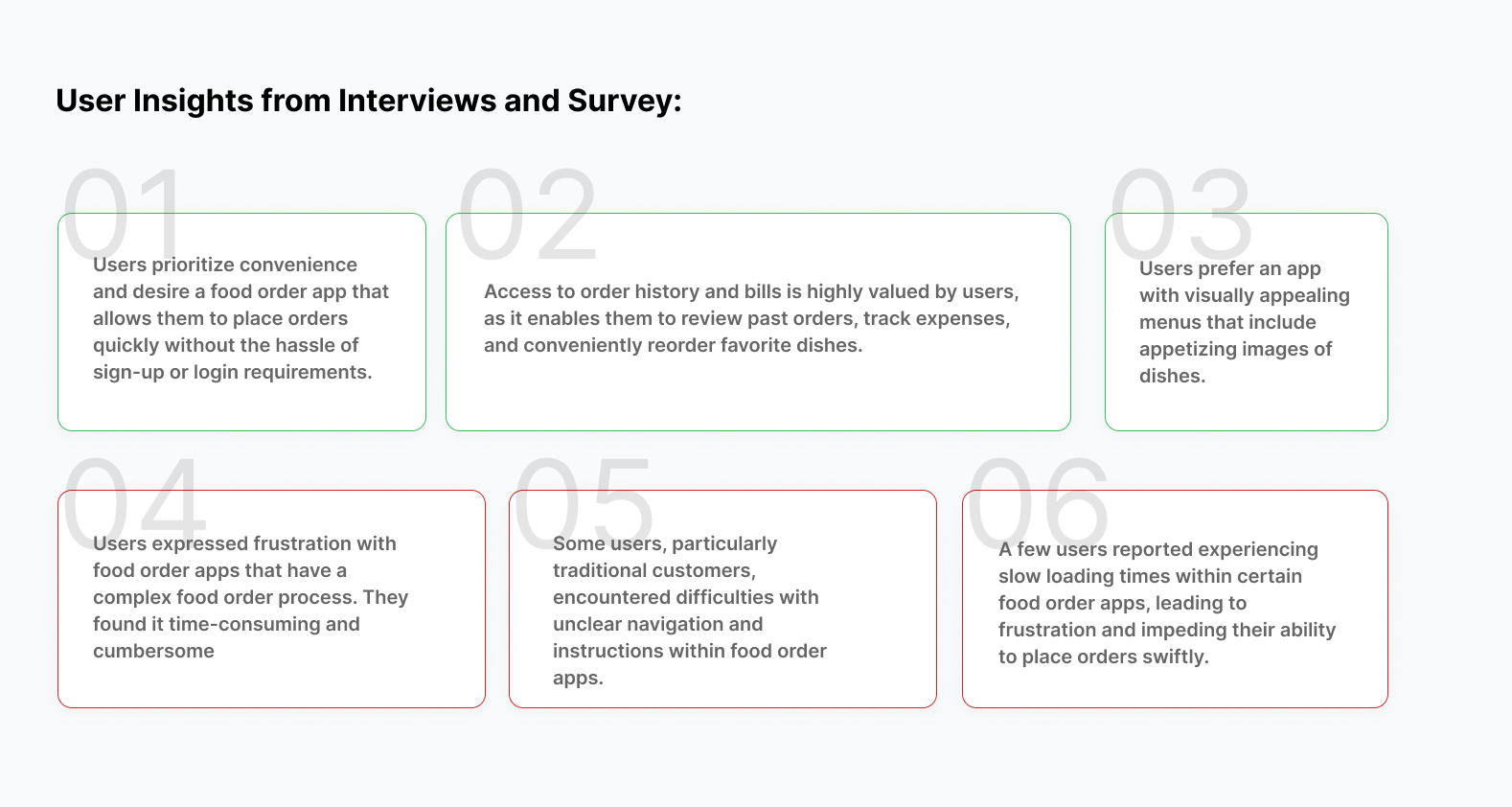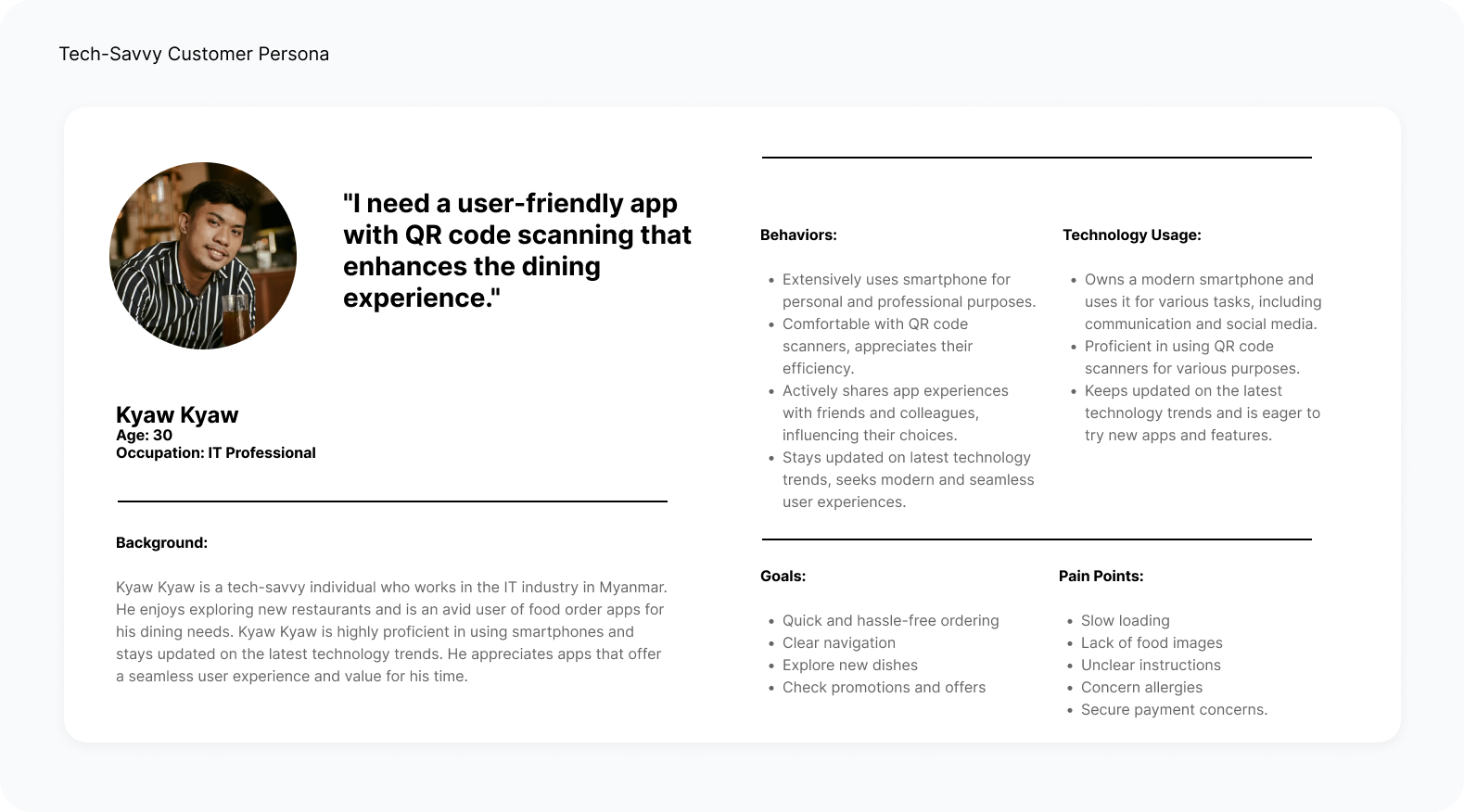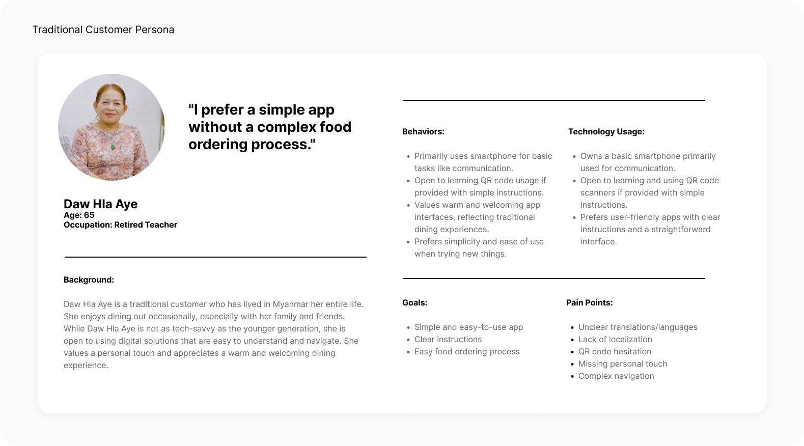 For user research, we conducted in-depth interviews with two distinct groups: tech-savvy customers (5 individuals) who frequently use food order apps and traditional customers (6 individuals) with limited app experience . Interviews were conducted both in-person and remotely, focusing on preferences, thoughts on QR code scanning, navigation, and desired features for the "Yummy Hot Pot" Food Order Web App.