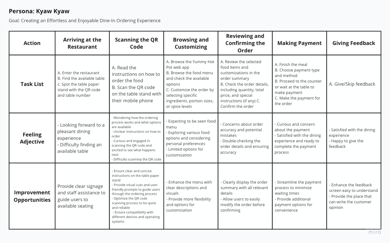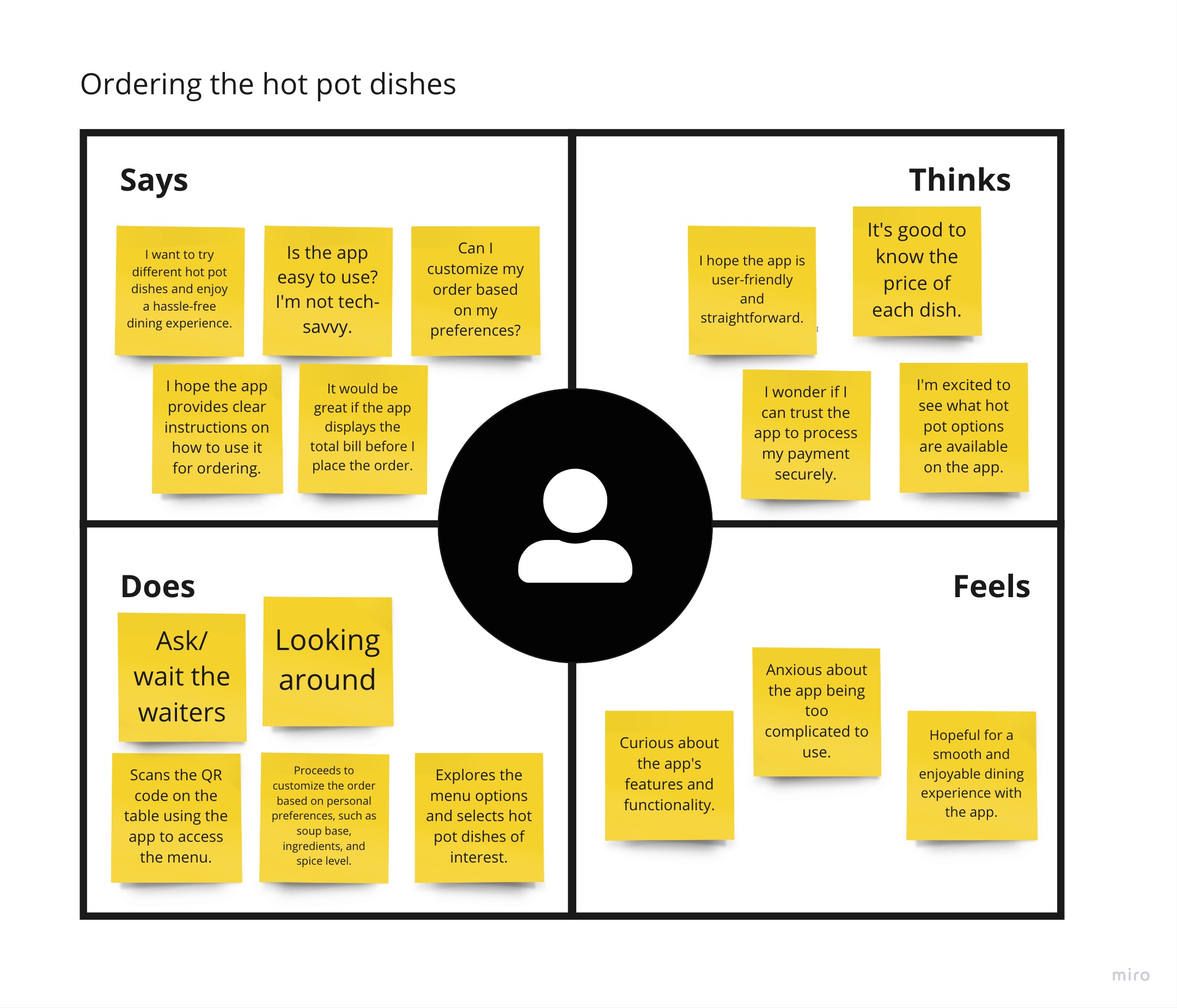 With the business goal and user insights in mind, we crafted a user journey map for the Yummy Hot Pot app. The map helps us ensure that our users reach the checkout screen seamlessly, identifying opportunities for improvement in the process.