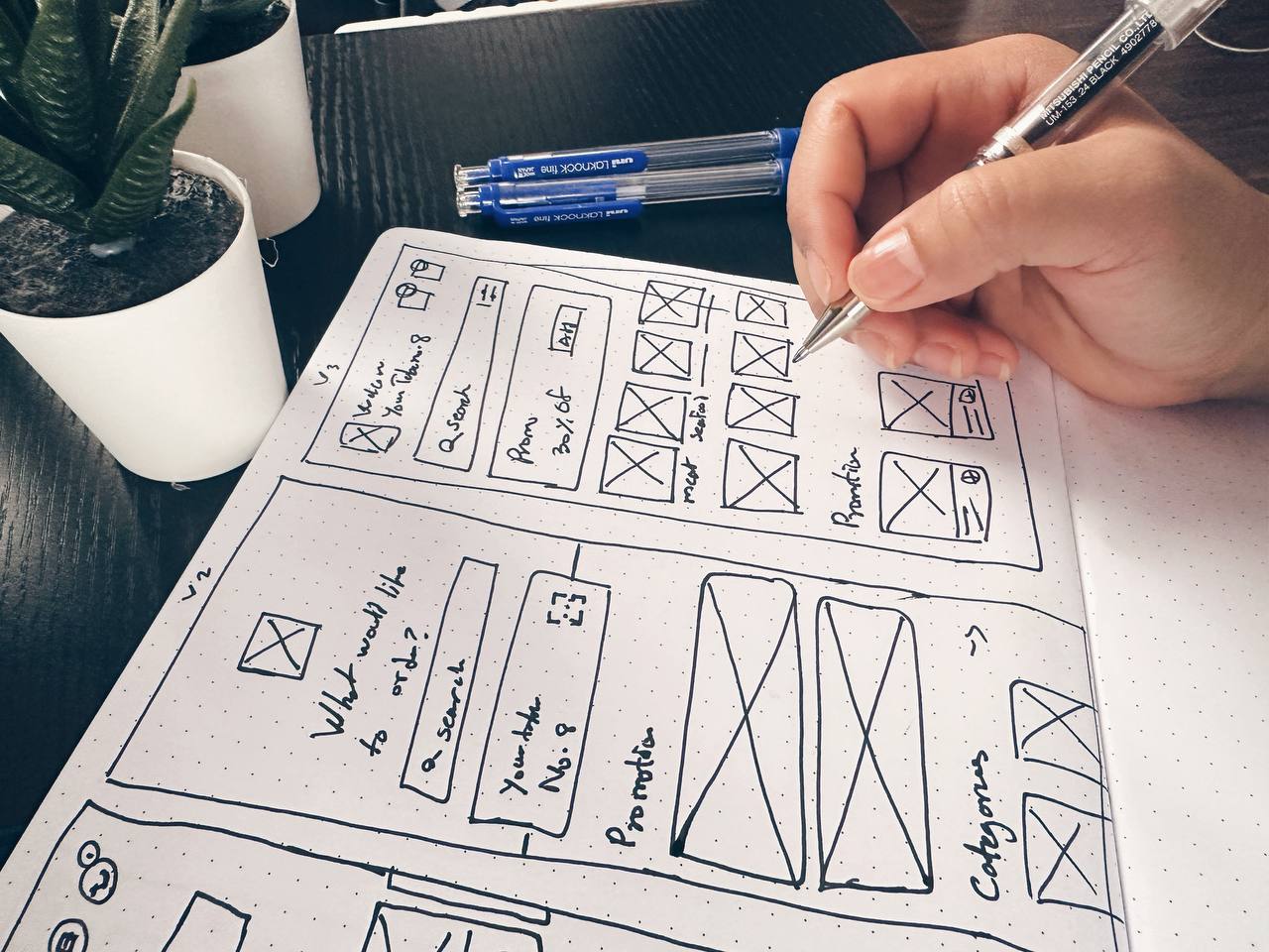 Multiple versions of the home page were created with different priorities, refining the design through brainstorming and paper wireframe iterations.