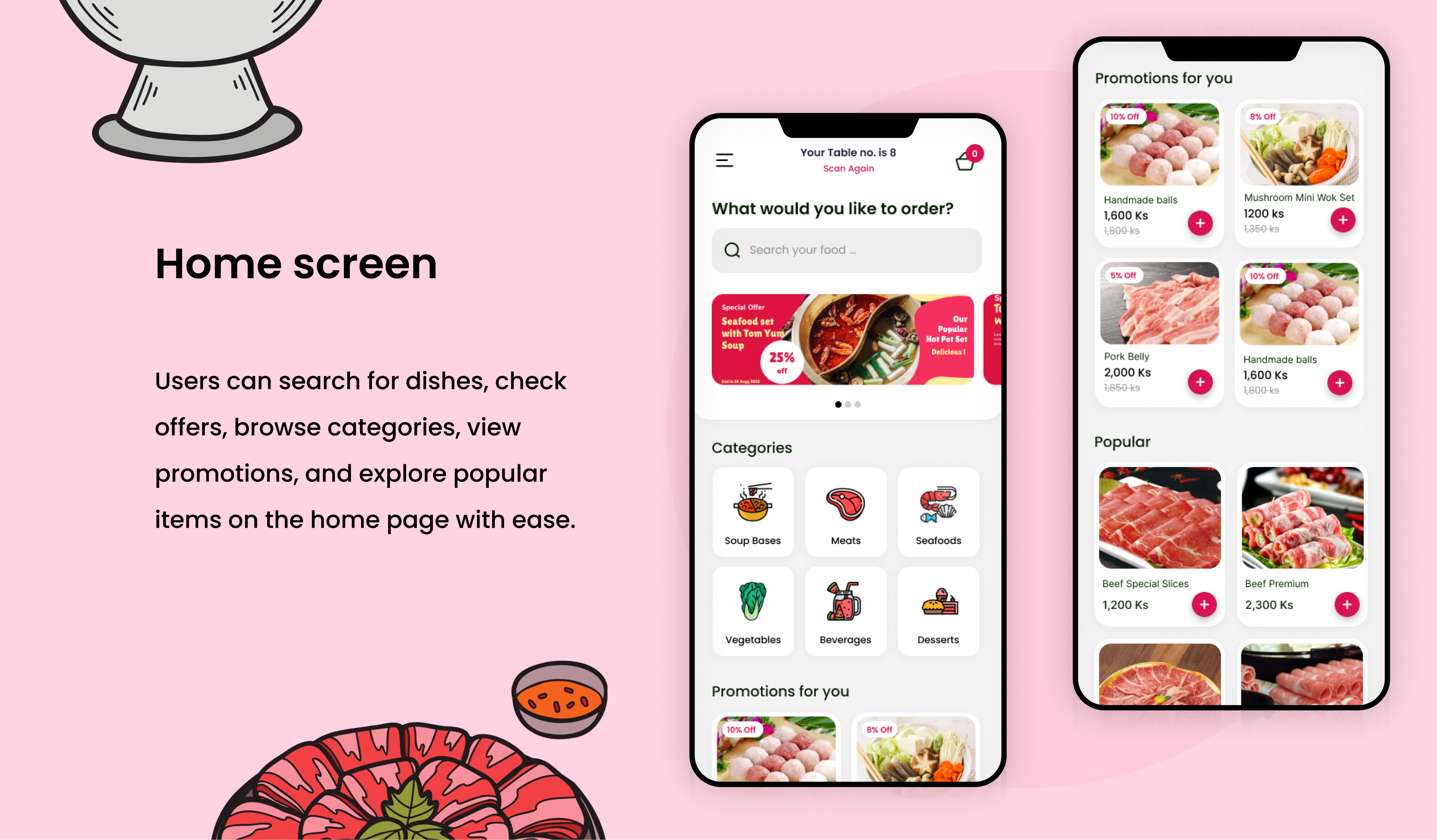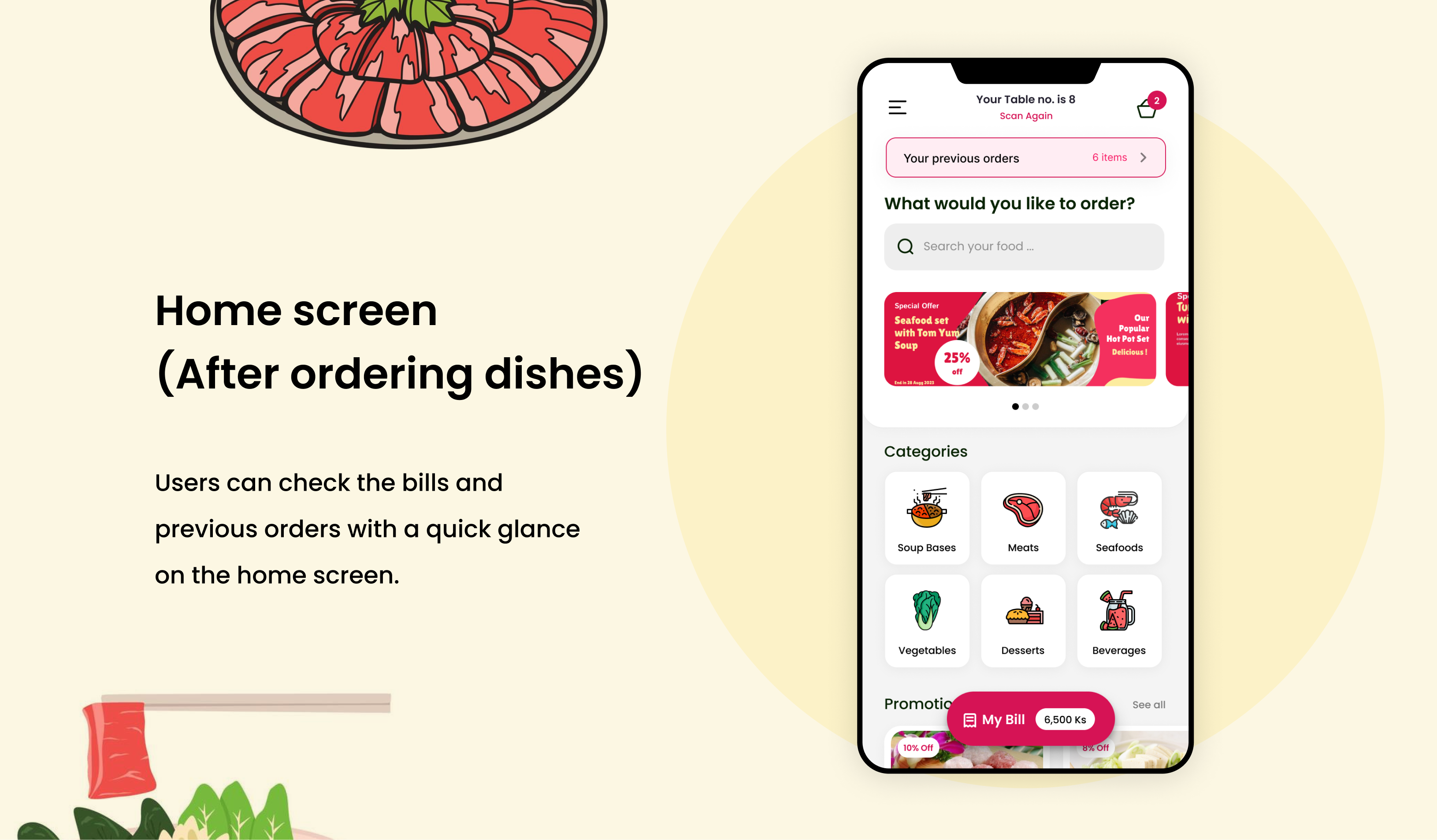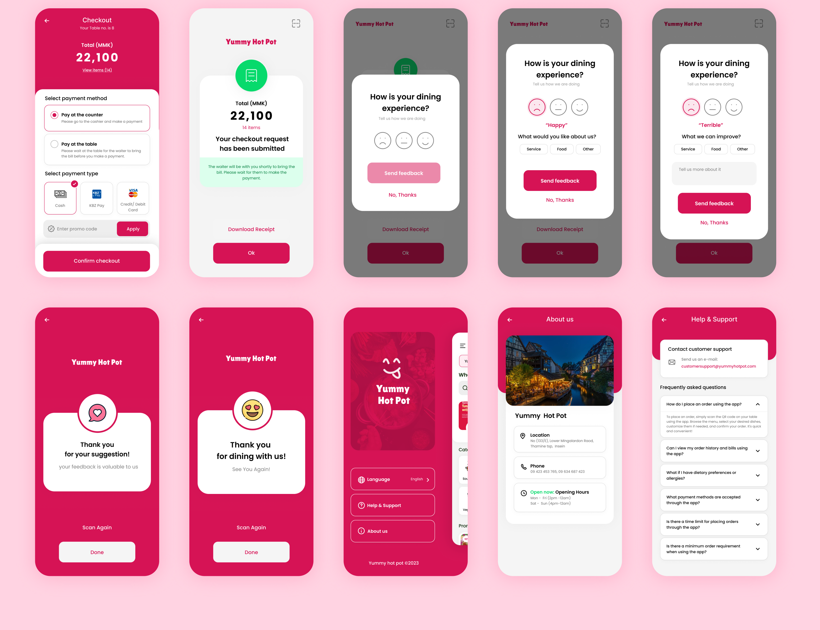 Yummy Hot Pot is a new restaurant that wants to enhance its customer experience by introducing a seamless food order web app . The app will simplify the ordering process by allowing users to order food by scanning a QR code at their table . This will eliminate the need for sign-up or login. Additionally, users will be able to access their order history and bills for convenience . As a UX/UI designer, I will create an intuitive and user-friendly app design for this project.