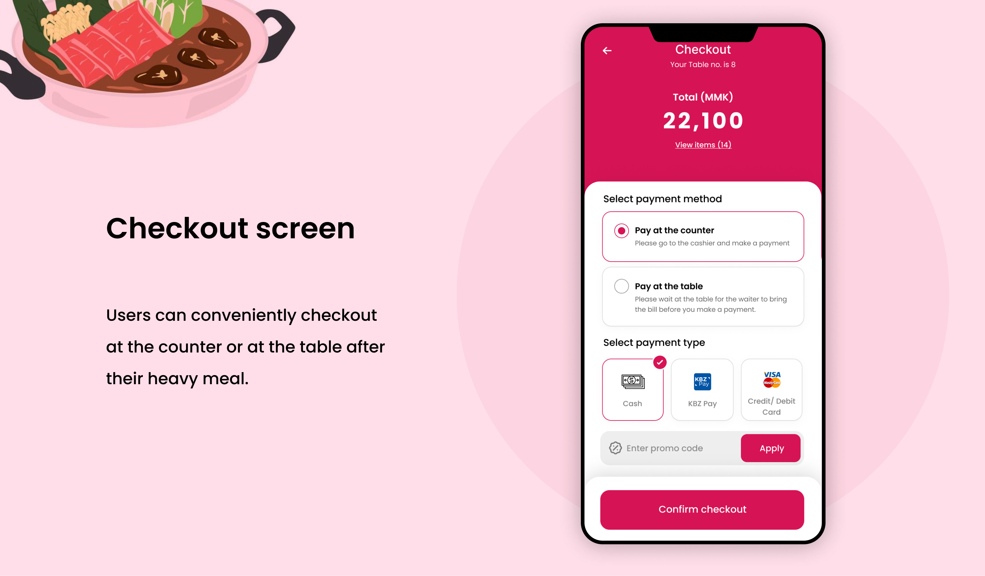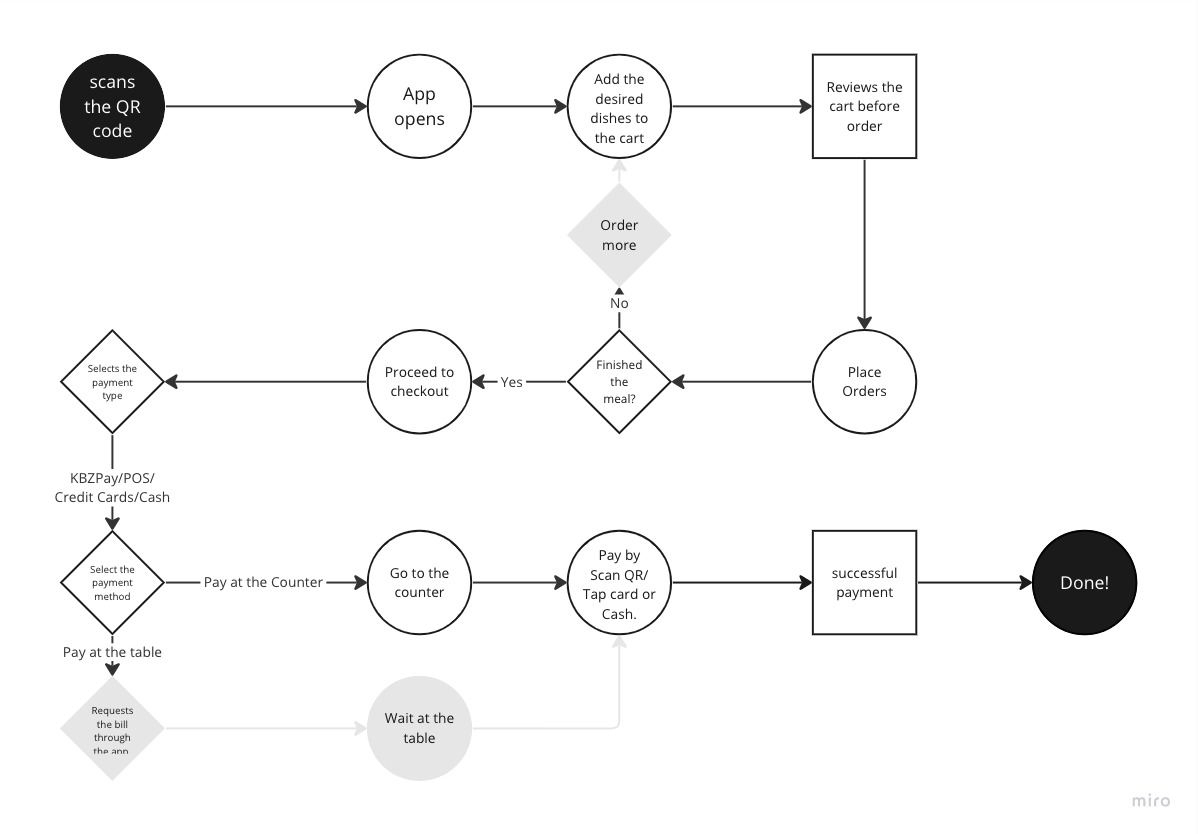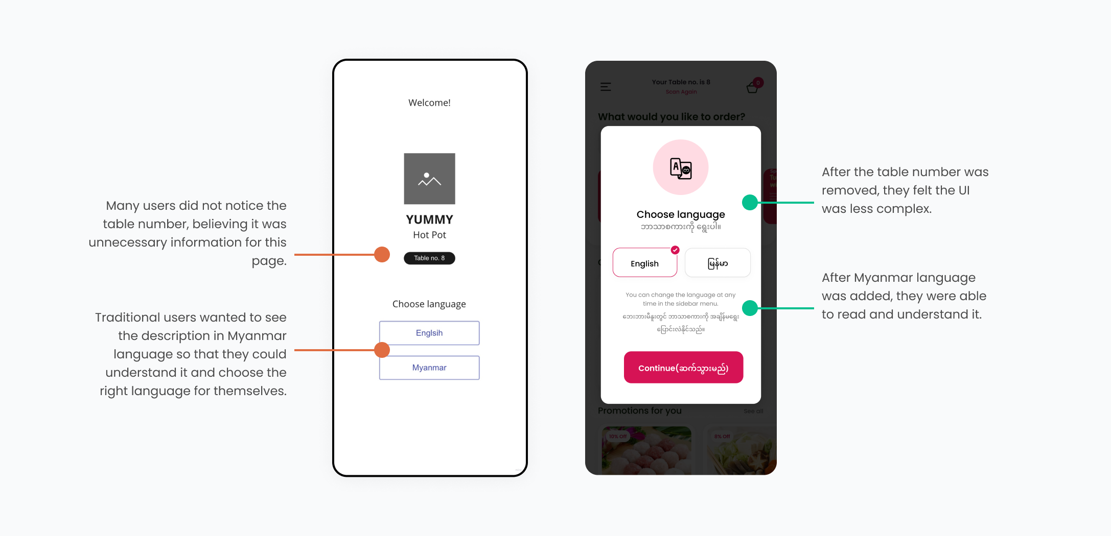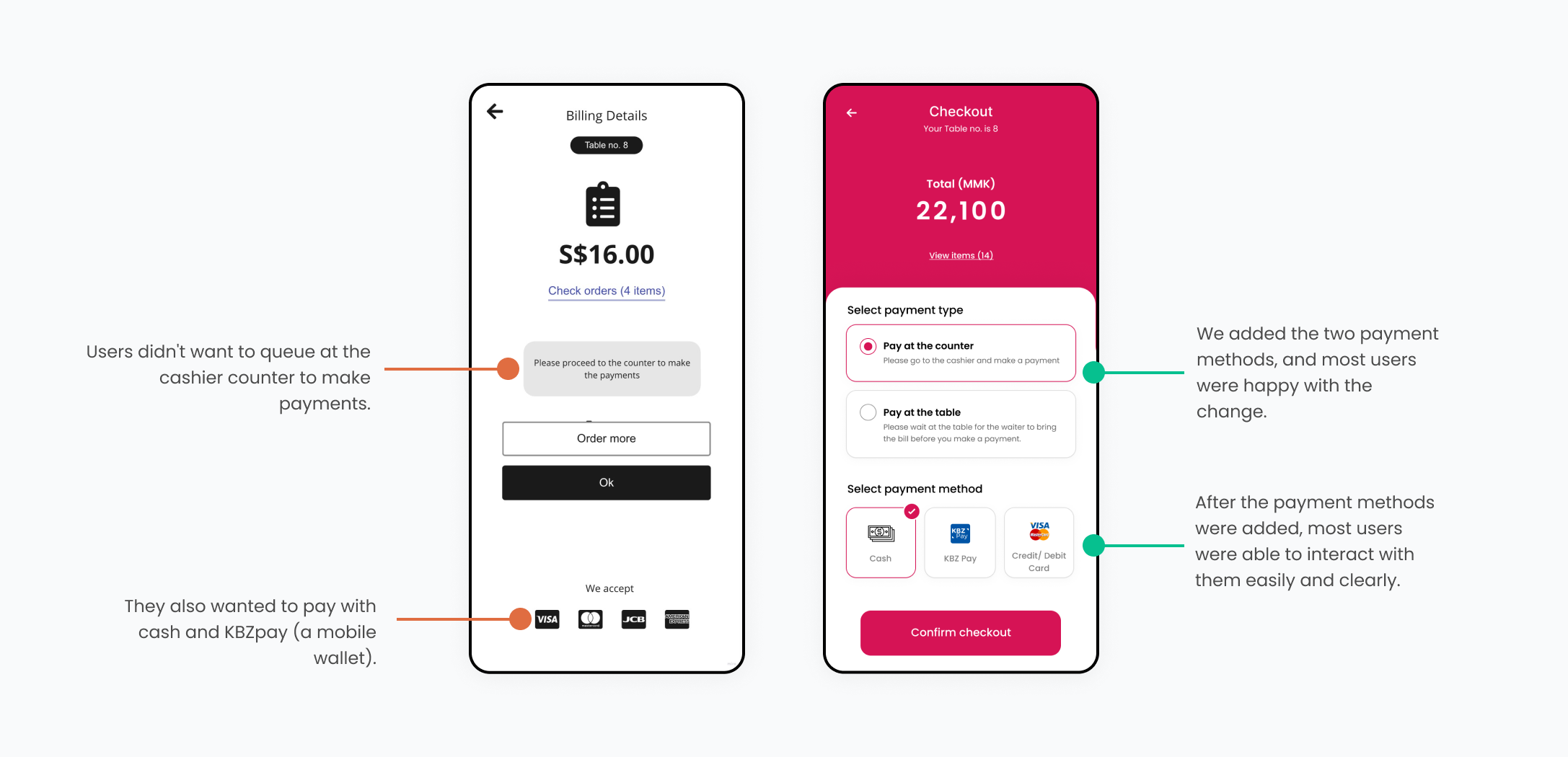 Our initial wireframe only showed one payment method: paying at the cashier counter with VISA/Mastercard. However, after a usability study, we found that users did not want to queue at the cashier counter after a heavy meal, especially if there was a crowd. They also wanted to know if the restaurant accepted KBZPay. Therefore, we added two new payment types: Pay at the Counter and Pay at the Table. Users can now choose their preferred payment method themselves.