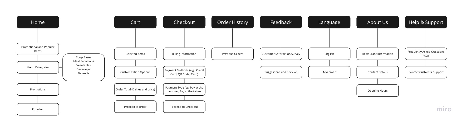 To organize the content and structure of the "Yummy Hot Pot" Food Order Web App, I created the Information Architecture. It ensures that users can easily access the menu, customize their orders, and view order history without any confusion.