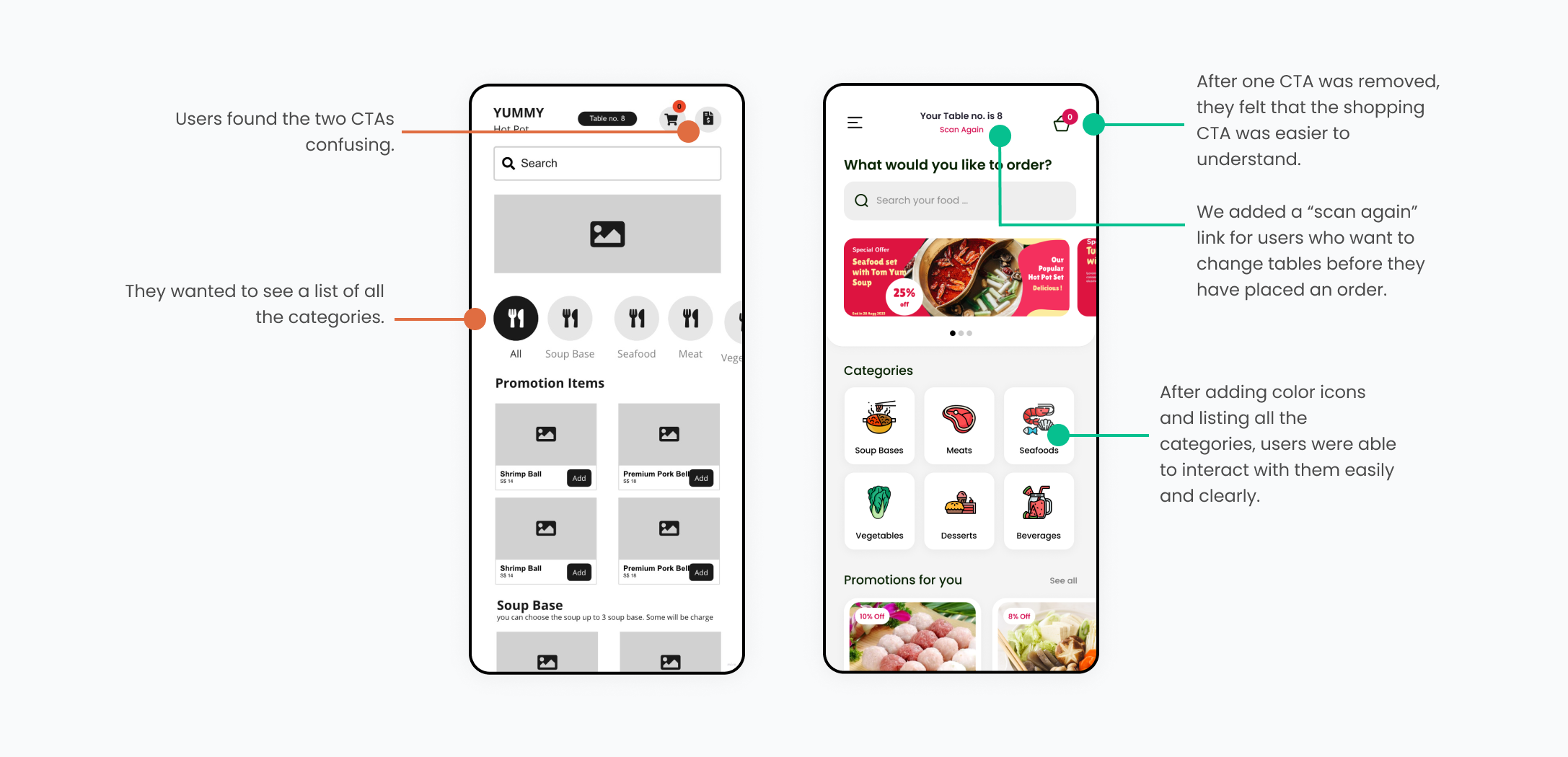 Our designs have received positive feedback from users, with one study participant commenting, "The app's user-friendly interface and intuitive navigation made ordering food a breeze. It saved me time and provided a seamless dining experience." The design improvements have resulted in enhanced user satisfaction and improved efficiency in the ordering process, contributing to a more enjoyable and convenient dining experience for users of the Yummy Hot Pot app.